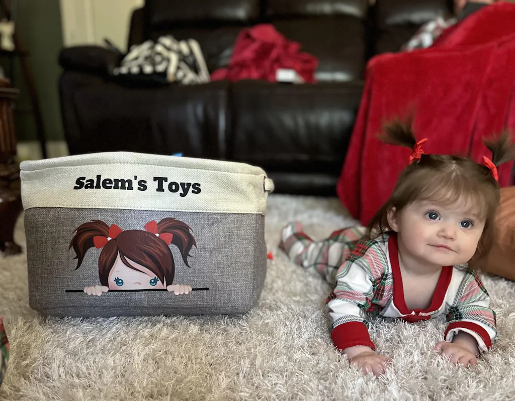 Uniquely Customizable Toy Storage Organizer For Kids is a One-of-a-kind kids-themed toy box that is customizable with a fun graphic of your kid and his or her name.